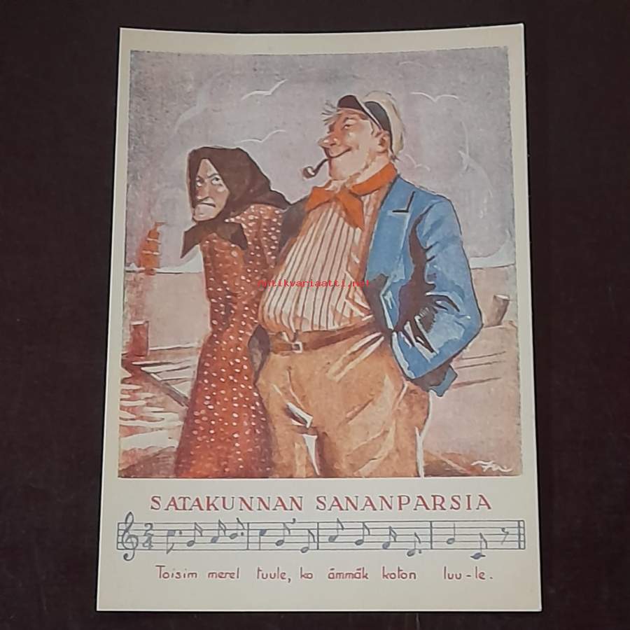 Postikortti: Satakuntalaisia sananparsia. Kortin piirtänyt Eeli Jaatinen. Kulkematon.