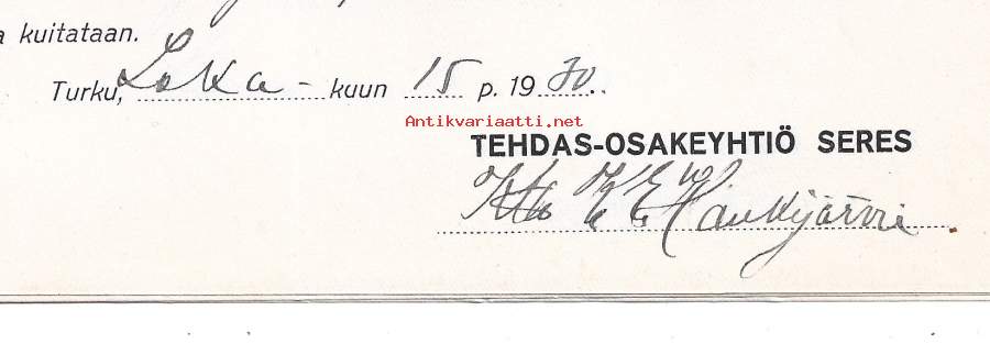 Tehdas Oy Seres Turku 1930 kuitti - firmalomake