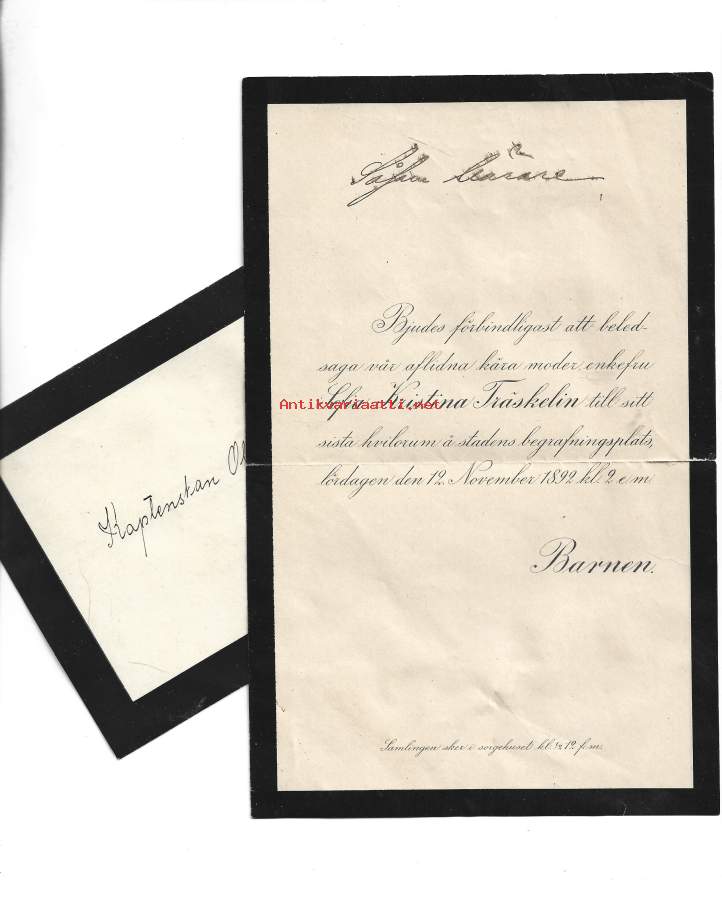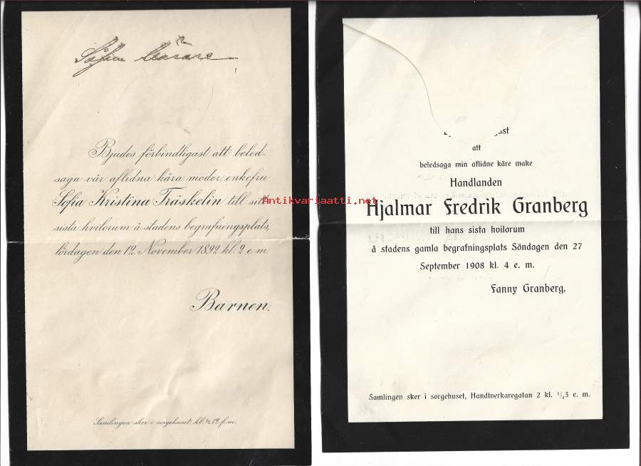 Hautajaiskutsu 1892 ja 1908 yht 2 kpl erä