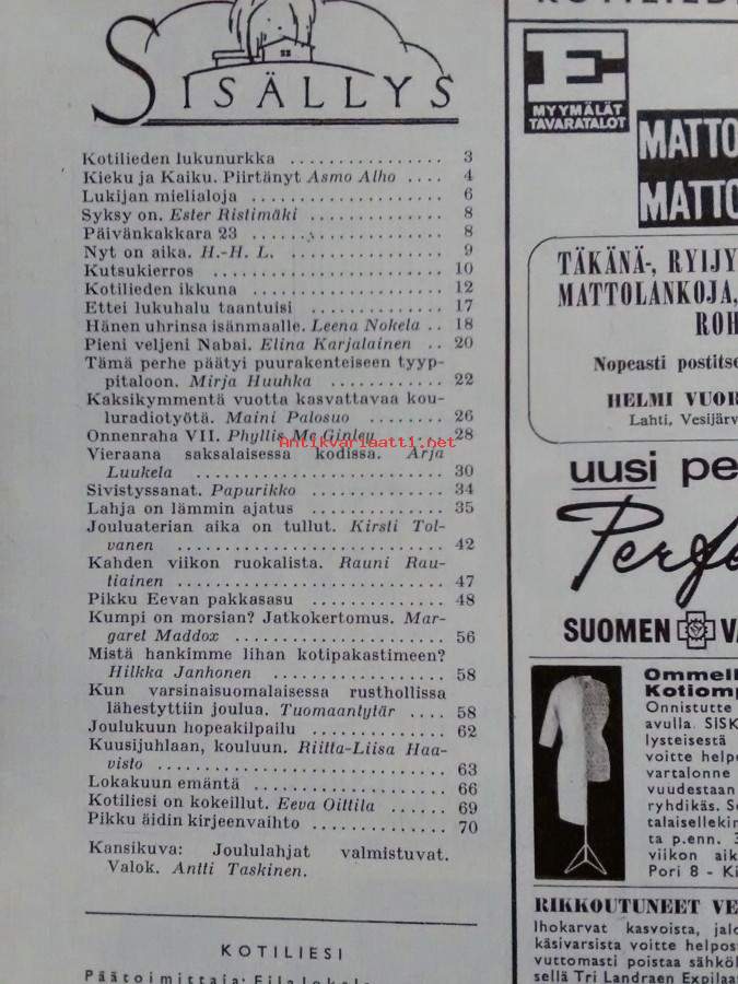 Ilmestynyt 3.12.1966,84s., sisällysluettelo kuvassa,sisällys mm. Kotilieden lukunurkka, Lukijan mielialoja, Syksy on, Nyt on aika, Kutsukierros, Kotilieden ikkuna, Ettei lukuhalu taantuisi, Hänen uhrinsa isänmaalle, Pieni veljeni Nabai, Tämä perhe päätyi puurakenteiseen tyyppitaloon, Kaksikymmentä vuotta kasvattavaa kouluradiotyötä, Onnenraha VII, Vieraana saksalaisessa kodissa, Sivistyssanat, Lahja on lämmin ajatus, Jouluaterian aika on tullutKahden viikon ruokalista, Pikku Eevan pakkasasu, Kumpi on morsian?, Mistä hankimme lihan kotipakastimeen?, Kun varhaissuomalaisesta rusthollissa lähestyttiin joulua, Joulukuun hopeakilpailu, Kuusijuhlaan, kouluun, Lokakuun emäntä, Kotiliesi on kokeillut, Pikku äidin kirjeenvaihto