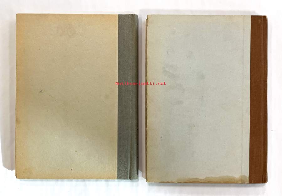 Hyvä. Ajan tuomaa kellastumaa kansissa, kosteusjälki toisen kirjan etukannen alaosassa, joitain merkintöjä sivuilla.