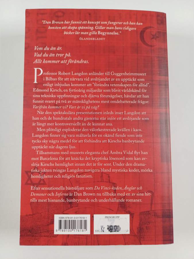 Muu(t) tekijä(t): Peter Samuelsson, Lena KarlinAlkuteos: OriginAsiasanat: historia, vetenskap, mordförsök, professorer, artificiell intelligens, forskare, tro, hemligheter, konspirationer, ateism