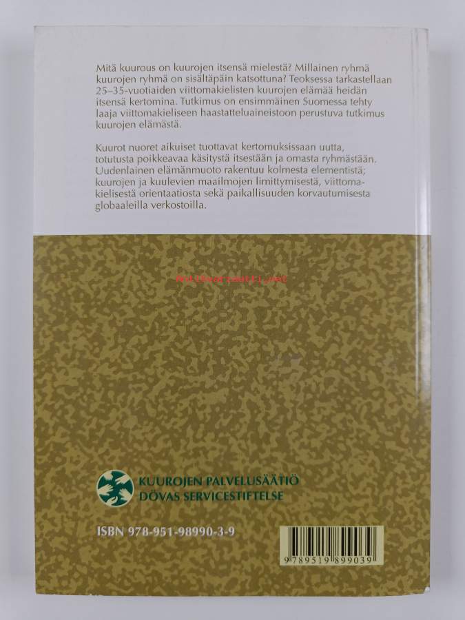 Asiasanat: arkielämä, identiteetti, minäkuva, kerronta, nuoret aikuiset, kuurot, kuulovammaiset, narratiivisuus, viittomakieli, kuurous, viittomakieliset