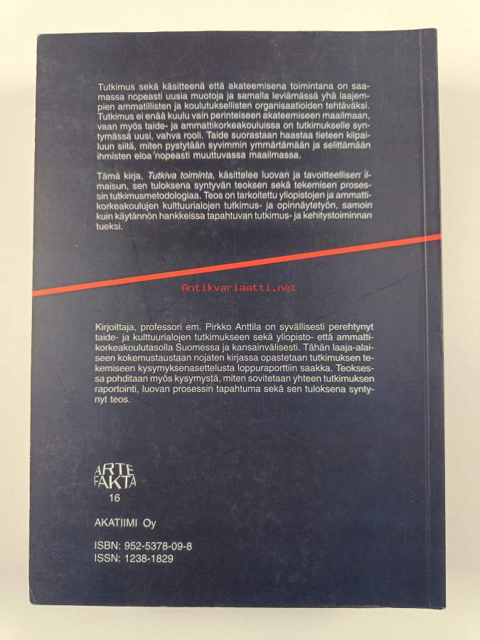 Merkinnät: exlibris: Paula PoikelaSarja: Artefakta 16Asiasanat: historia, tutkimus, taide, luovuus, filosofia, arvot, taideteokset, ilmaisu, tiede, ammattikorkeakoulut, tutkimusmenetelmät, taidekorkeakoulut, tutkimustyö, tutkimusaineisto, kulttuuriala, kvalitatiivinen tutkimus, tieteenfilosofia, tietoteoria, metodologia, tiedonhankinta, luova toiminta, taiteentutkimus, oppaat (teokset), taiteellinen tutkimus, tutkimus- ja kehittämistoiminta, research, kvantitatiivinen tutkimus, Science, Creativity, Arts, taideaineet, kulttuurijohtaminen, arts management