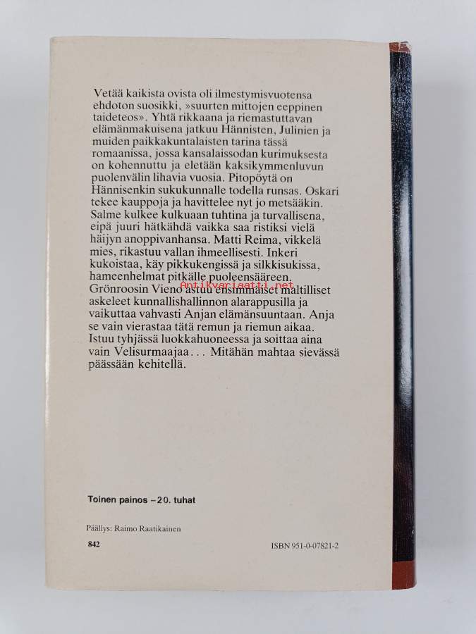 Hyvä. Tarkempi kuntoluokka: K3+ ; Selkämyksessä hieman vinoutta. Kansipaperin kunto: jonkin verran kulumaa/pienoisia repeämiä
