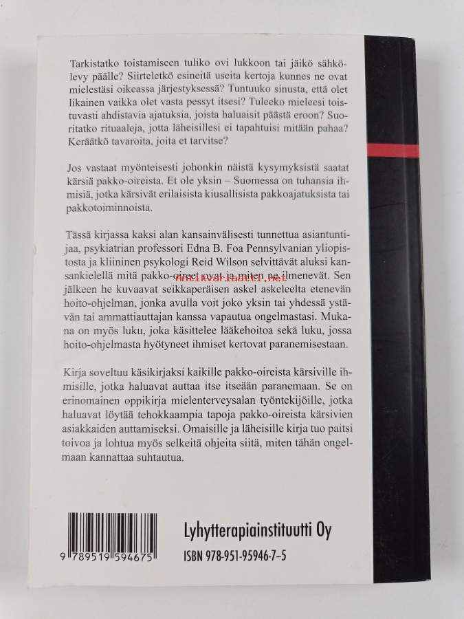 Muu(t) tekijä(t): Riitta Bergroth, Robert R. WilsonSarja: Mieli-kirjatAlkuteos: Stop obsessingAsiasanat: hoitomenetelmät, itsehoito, neuroosit, rituaalit, pakkomielteet, behandlingsmetoder, egenvård, tvångsföreställningar, ritualer, neuroser
