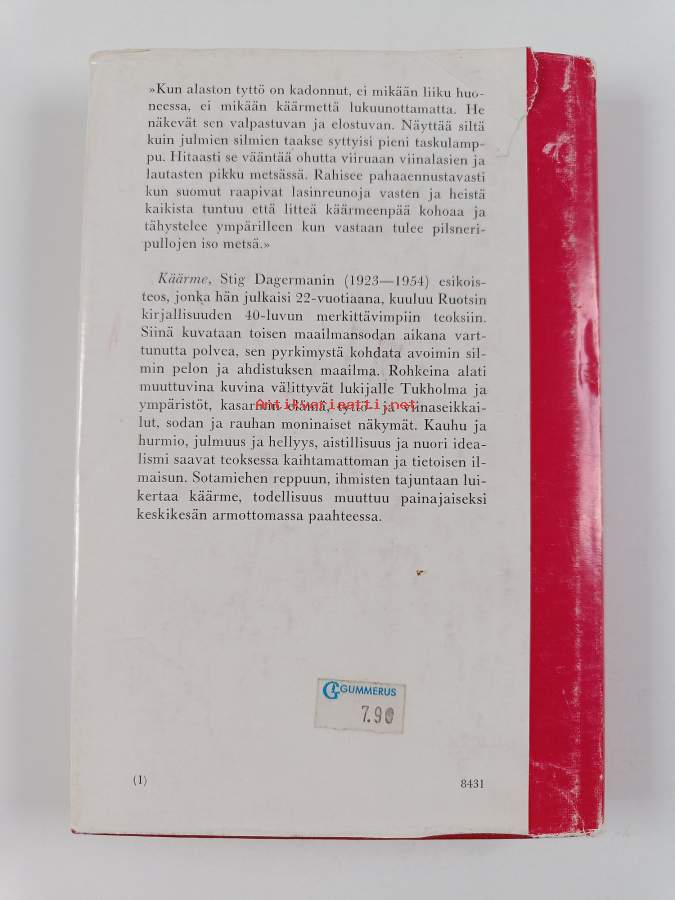 Hyvä. Tarkempi kuntoluokka: K3+ ; Hieman kulumaa kansissa, pienoista kolhua selkämyksen päissä, edessä vanha hintalappu, takana vanha hintalappu. Kansipaperin kunto: repeämiä/kulumaa