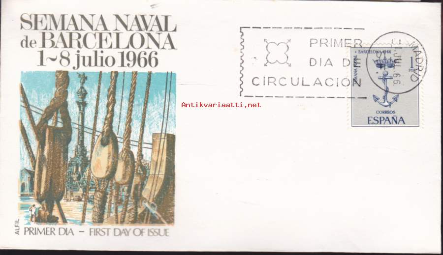 **Laadukas ALFIL‑ensipäiväkuori, vasemman reunan meriaiheisella painatuksella (Barcelona / Kolumbus‑monumentti).Postimerkki: Marina Española – Barcelona 1966.Selkeä ensipäiväleima: Madrid, 1 JUL 66 – Primer día de circulación.**