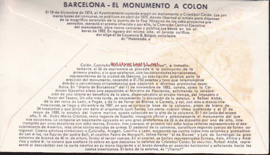FDC - España 1965. Barcelona – Monumento a ColónPrimer día de emisión – 17.3.1965. (Kolumbuksen muistomerkki