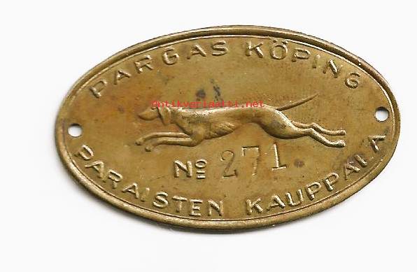 vanha Paraisten kauppalan (Pargas köping) koiranveromerkki tai tunnistelaatta, jonka numero on 271.Esine on valmistettu messingistä ja siinä on kuva juoksevasta koirasta.Tällaisia laattoja käytettiin yleisesti 1900-luvun alkupuolella koiranomistajien rekisteröintiin ja verotukseen.