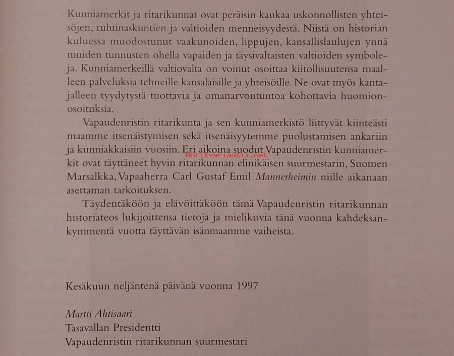 Teoksessa on luotu katsaus ritarikuntalaitoksen kunniamerkkien vuosituhantiseen historiaan sekä on pyritty antamaan monipuolinen kuva kunniamerkkien saajista kevään 1918 ensimmäisistä Vapaudenristeistä alkaen. Kuvitettu. Dimensiot 30 ¤ 22 cm.