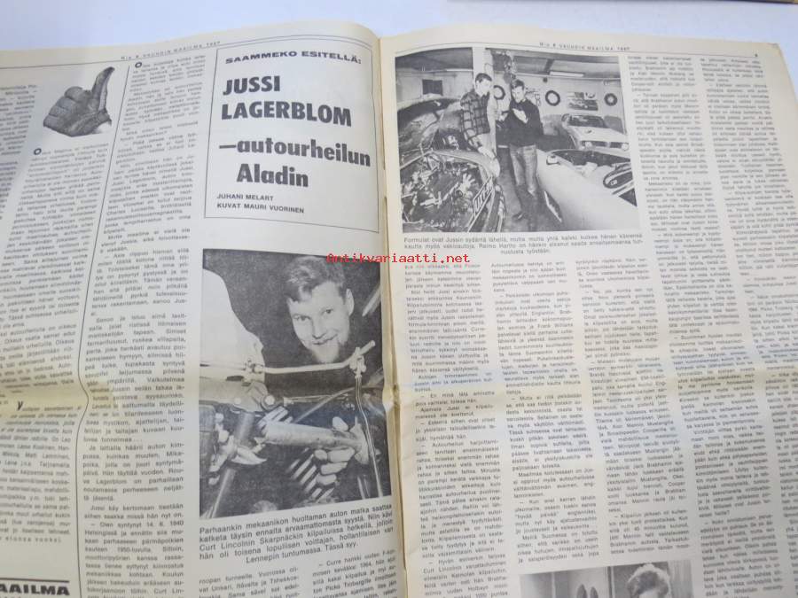 Vauhdin maailma 1967 nr 8, sis. mm. seur. artikkelit / kuvat / mainokset; Jätkä mä meen ensin, Saammeko esitellä Jussi Lagerblom autourheilun Aladin, III