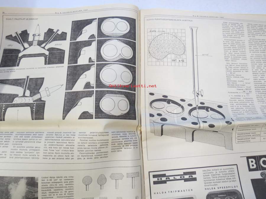 Vauhdin maailma 1967 nr 8, sis. mm. seur. artikkelit / kuvat / mainokset; Jätkä mä meen ensin, Saammeko esitellä Jussi Lagerblom autourheilun Aladin, III Tampere-ralli... noin kaksi ja puoli kilometriä lähdöstä äkkijyrkkä kurvi..., Moottoriklinikka, Coupe des Alpes 1967, Isuzu Bellett 1500 sport tekniset tiedot ja kuvat, Rata-ajon SM 1967, F1 Italian GP ison Hondan ensimmäinen, Kuukauden profiili Pentti Airikkala, Amedee Gordinin 8-piippunen ase, katso sisältö kuvista tarkemmin.27 x 42 cm.