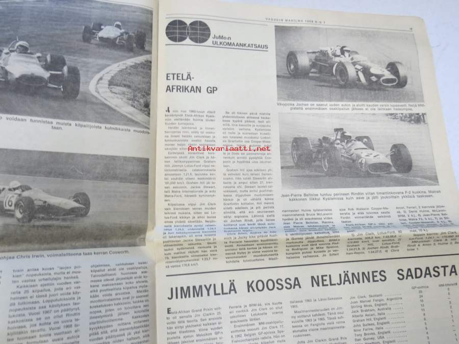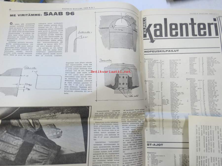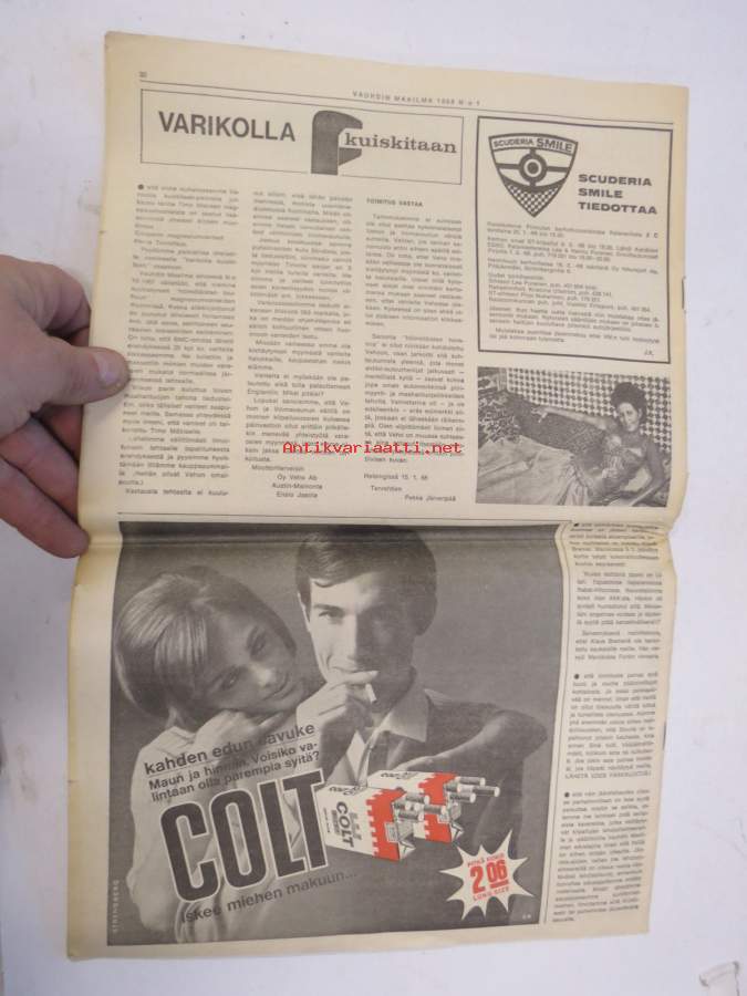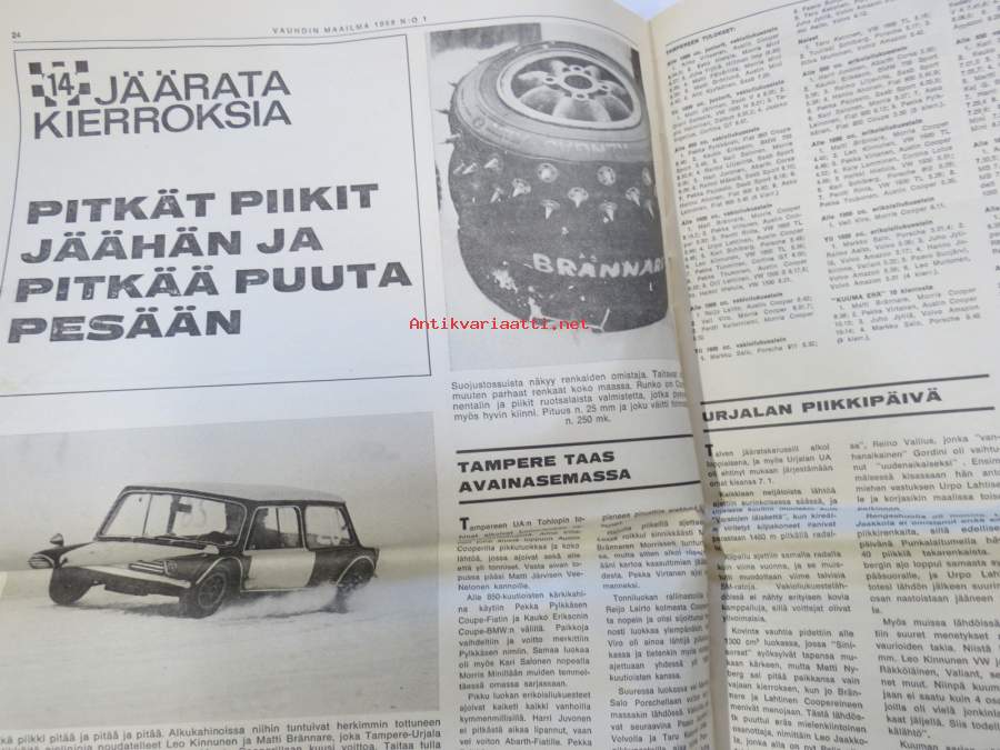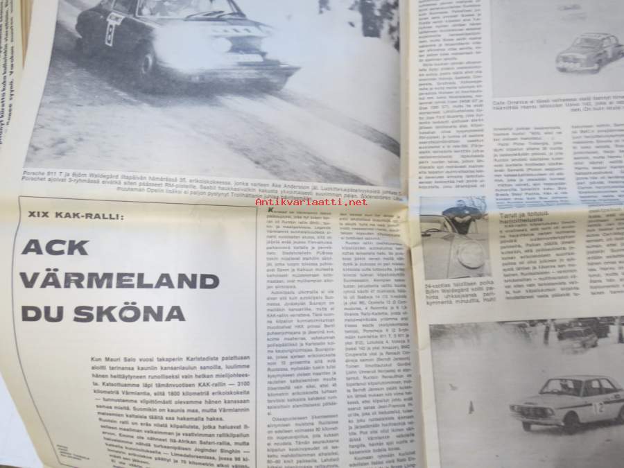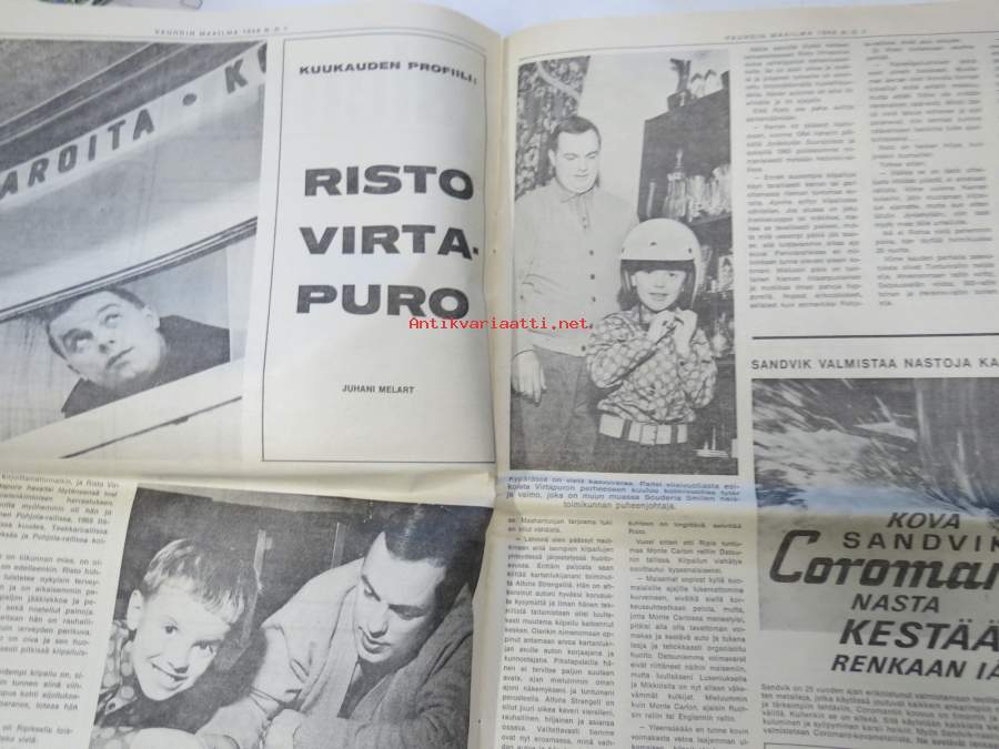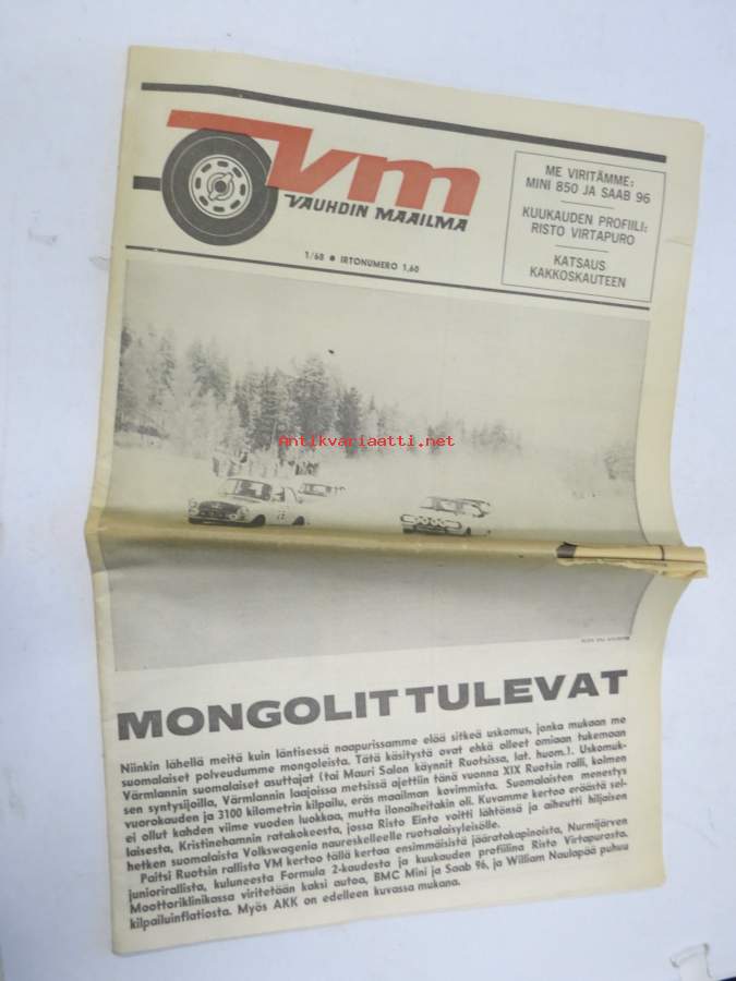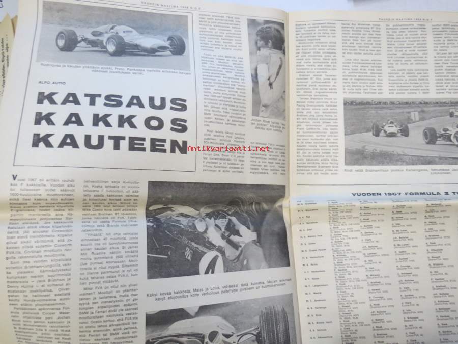Vauhdin Maailma 1968 nr 1 sis. mm. seur. artikkelit / kuvat / mainokset; Mongolit tulevat, Esittelyssä Sylvia Österberg, XIX KAK-ralli - Ack Värmeland du sköna, Katsaus F-2 kauteen, Jim Clark, I Nurmijärven ralli, Me viritämme BMC Mini 850 & Saab 96, Kuukauden profiili - Risto Virtapuro, Terveiset Monte Carlosta, Mitä on ST-ajo, ym.27 x 42 cm.