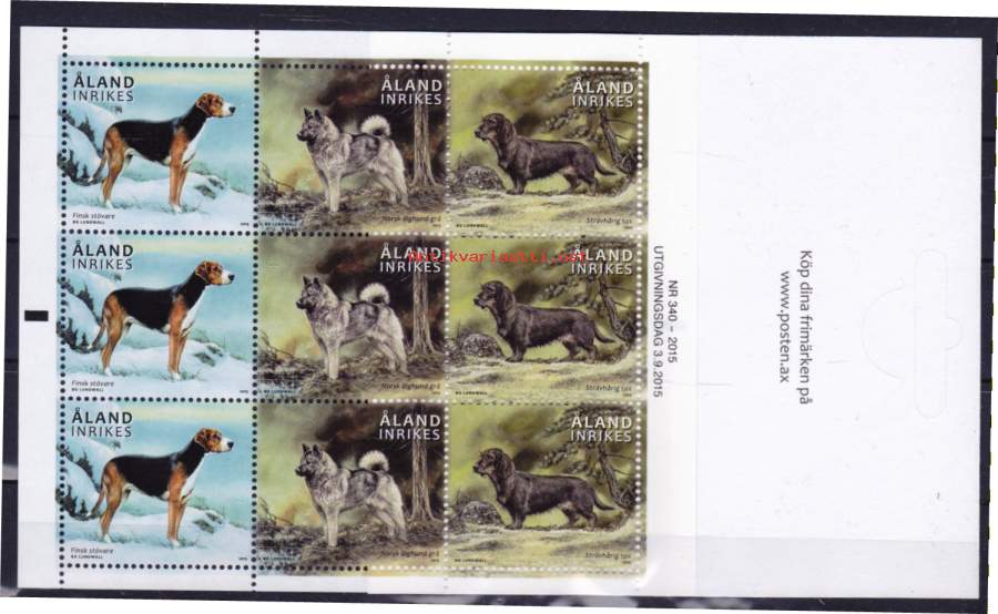 Filatelia - Ahvenanmaa - Åländska jakthundar - Ahvenanmaalaisia metsästyskoiria ** postituore vihko ÅV26 (2015). Postitusarvo Ahvenanmaalla on 3,80€ x 9= 34,20€!!
