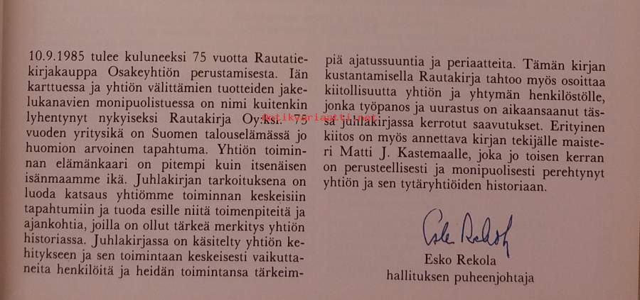 Rautakirjan 75‑vuotisjuhlakirja. Yrityshistoriikki, joka kuvaa Rautakirjan kehitystä, toimintaa ja erityisesti R‑kioskin roolia suomalaisessa arjessa ja erityisesti R-kioskin historiaa. Kuvitettu. Dimensiot 26 ¤ 21 cm.
