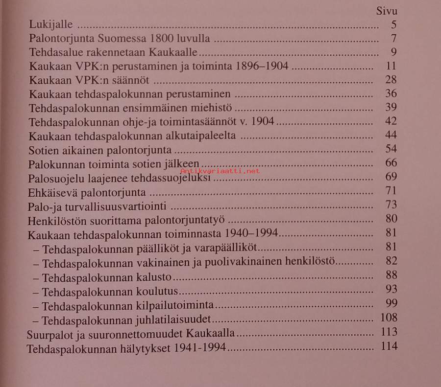 Historiikki (1895-1995) Kaukaan alueen palontorjunnasta ja palokuntatoiminnasta käsitellen palokuntien, tehtaiden ja alueen palontorjunnan kehitystä. Kuvitettu. Dimensiot 25 ¤ 18 cm.