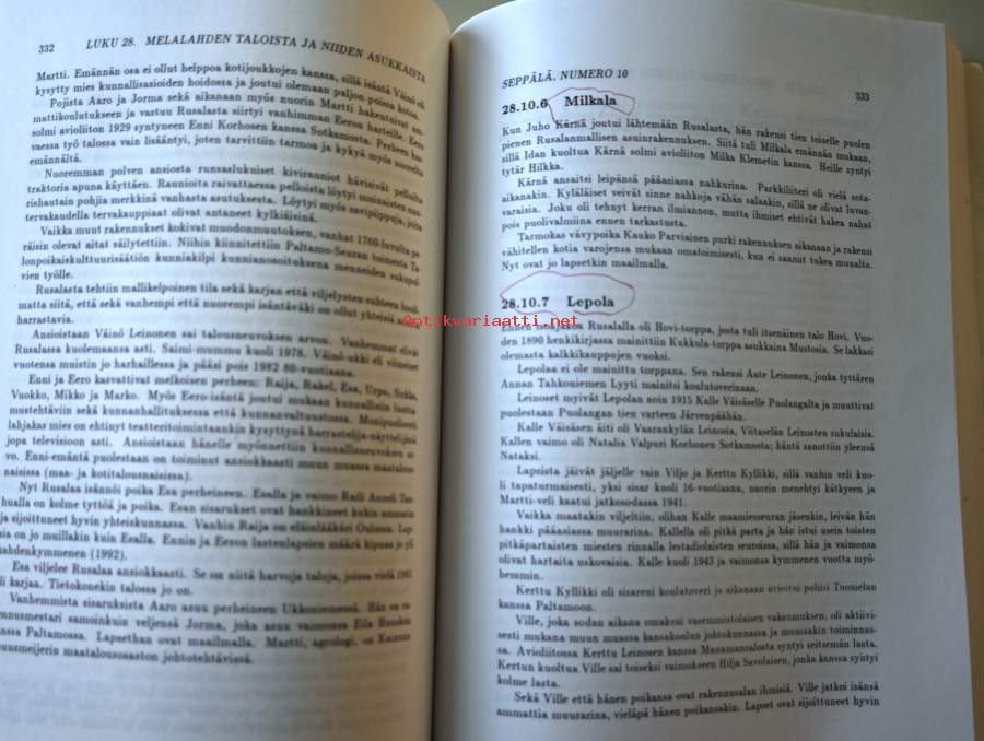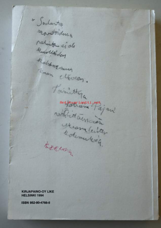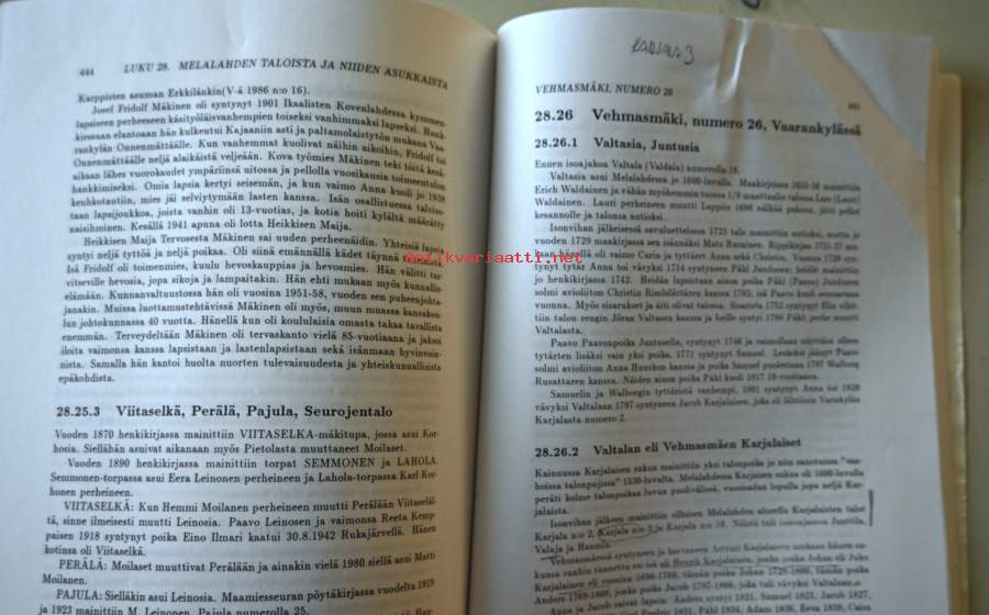 Kirjassa merkintöjä ja klemmareista jälkiä sivujen yläosassa, katso kuvista