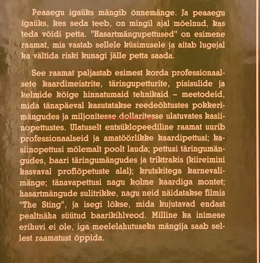 Kirja on perusteellinen opas uhkapelimaailman huijauksiin ja se on jaettu kolmeen pääteemaan: paljastetaan ammattimaisten korttihuijareiden, noppahuijareiden ja muiden pikkusulien käyttämät tekniikat, miten ne tunnistetaan, miten niiltä suojaudutaan. Dimensiot 21 ¤ 15 cm. Kuvitettu.See raamat paljastab esimest korda professionaalsete kaardimeistrite, täringupetturite, pisisulide ja kelmide kõige hinnatumaid tehnikaid – meetodeid, mida tänapäeval kasutatakse reedeõhtustes pokkerimängudes ja miljonitesse dollaritesse ulatuvates kasiinopettustes. Ulatuselt entsüklopeediline raamat uurib professionaalseid ja amatöörlikke kaardipettus.......