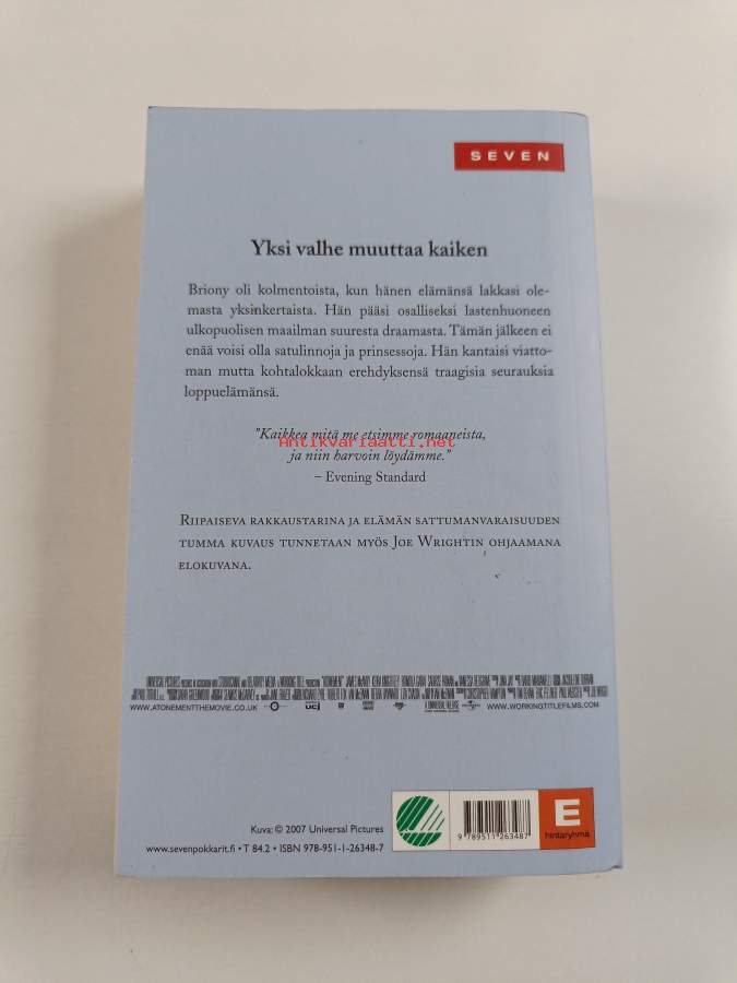 Muu(t) tekijä(t): Juhani LindholmSarja: SevenAlkuteos: AtonementAsiasanat: kirjailijat, kirjoittaminen, syyllisyydentunne, toinen maailmansota, kartanot, sotilaat, perhe, sairaanhoitajat, sotarintama, sisarukset, sotasairaalat, seksuaalirikokset, valheet, psykologiset romaanit, kehitysromaanit, metafiktio