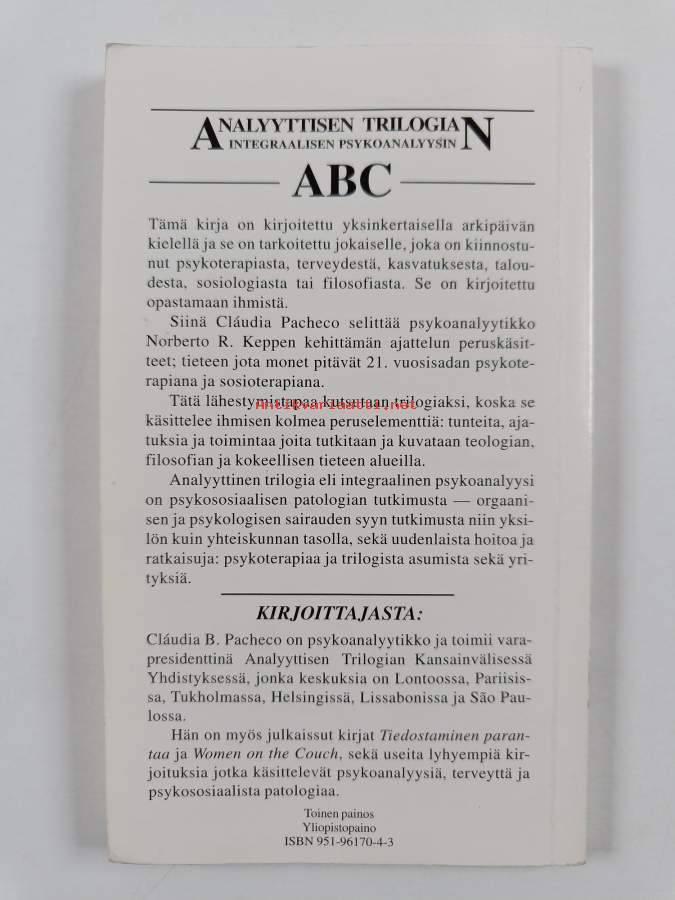 Muu(t) tekijä(t): Anneli Kilpeläinen, Rauha RiihinenAlkuteos: ABC da trilogia analítica : psicanálise integralAsiasanat: psykoterapia, analyyttinen trilogia, psykoanalyysi, sosioterapia