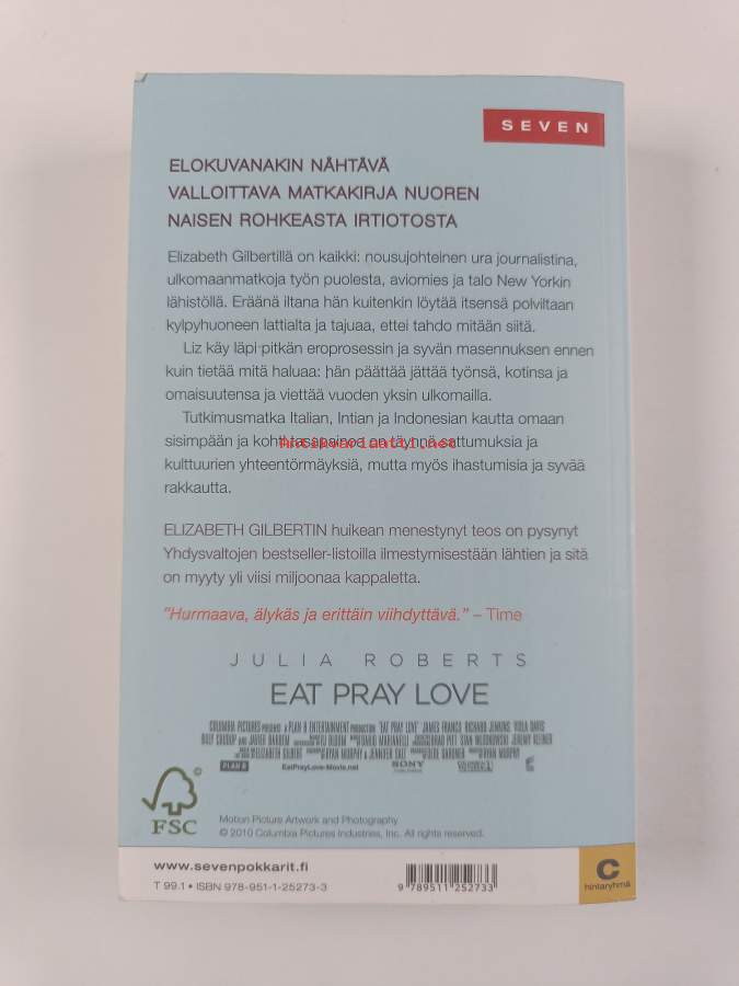 Muu(t) tekijä(t): Taina AarneSarja: SevenAlkuteos: Eat, pray, loveAsiasanat: muistelmat, matkakertomukset, kirjailijat, matkat