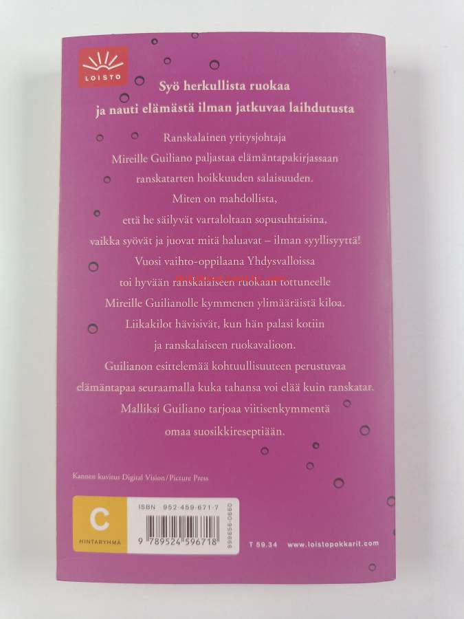 Muu(t) tekijä(t): Laura JänisniemiMerkinnät: omistajamerkintä (tarra)Alkuteos: French Women Don't Get Fat. The Secret of Eating for PleasureAsiasanat: elämäntapa, ruokavaliot, laihdutus, painonhallinta