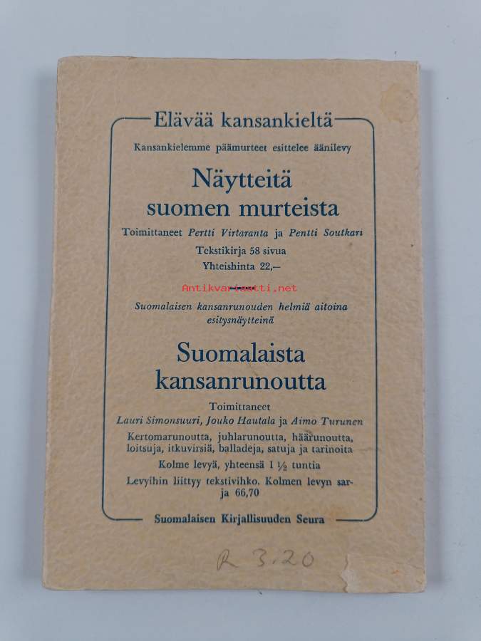 Hyvä. Tarkempi kuntoluokka: K3- ; Hieman nuhruisuutta, kansien reunoilla taittumaa ja rispaantumaa (koska ohuehkot kannet sivuja leveämmät)