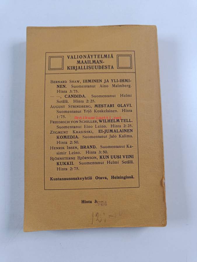 Hyvä. Tarkempi kuntoluokka: K3- ; Hieman tahraisuutta, hieman kulumaa, selkämyksessä hieman vinoutta, selkämyksessä lukutaittumaa