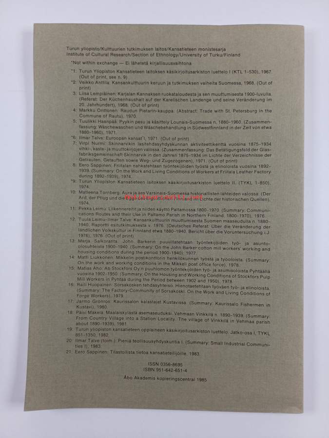 Merkinnät: omistajamerkintäSarja: Turun yliopiston kulttuurien tutkimuksen laitos. Kansatiede. Monisteita 22Asiasanat: Finland, levnadsförhållanden, etnologi, arbetare, arbetsförhållanden, glasblåsning, glasfabriker