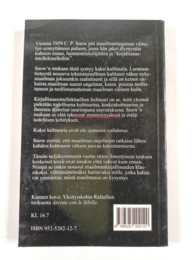 Muu(t) tekijä(t): Stefan Collini, Kimmo PietiläinenAlkuteos: The two culturesAsiasanat: maailmankuva, kulttuuri, luonnontieteet, älymystö, tieteenfilosofia, luonnontieteilijät, tieteentutkimus, humanistiset tieteet, tieteenalat, Science and the humanities