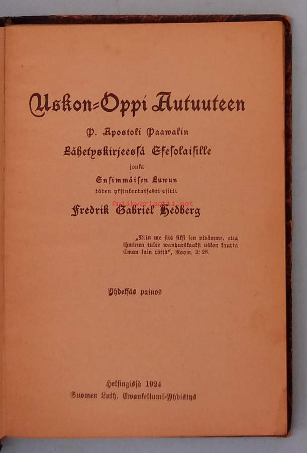 Teos on luterilainen raamatunselitys ja armonvanhurskauden oppi Efesolaiskirjeen 1. luvun pohjalta. Dimensiot 16 ¤ 12 cm.