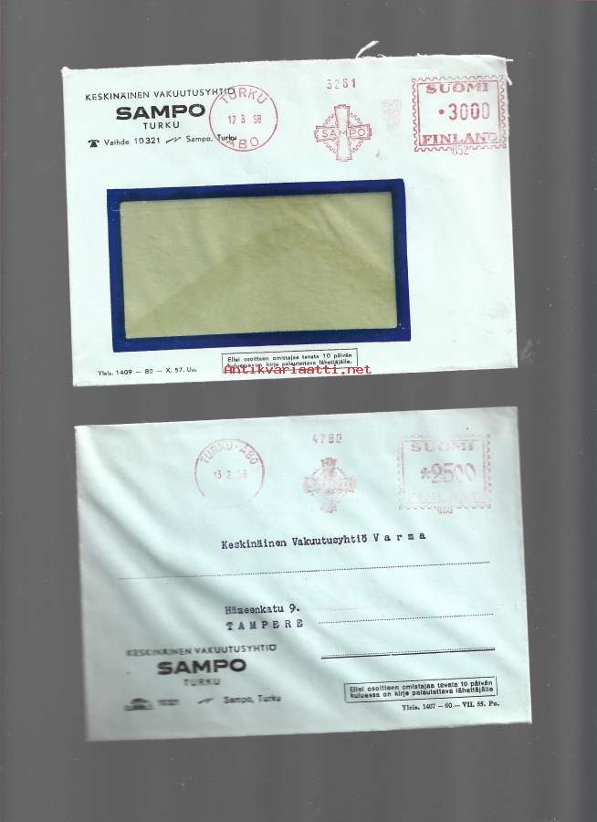 Keskinäinen Vakuutusyhtiö Sampo Turku 1958 ja 1956 firmakuori