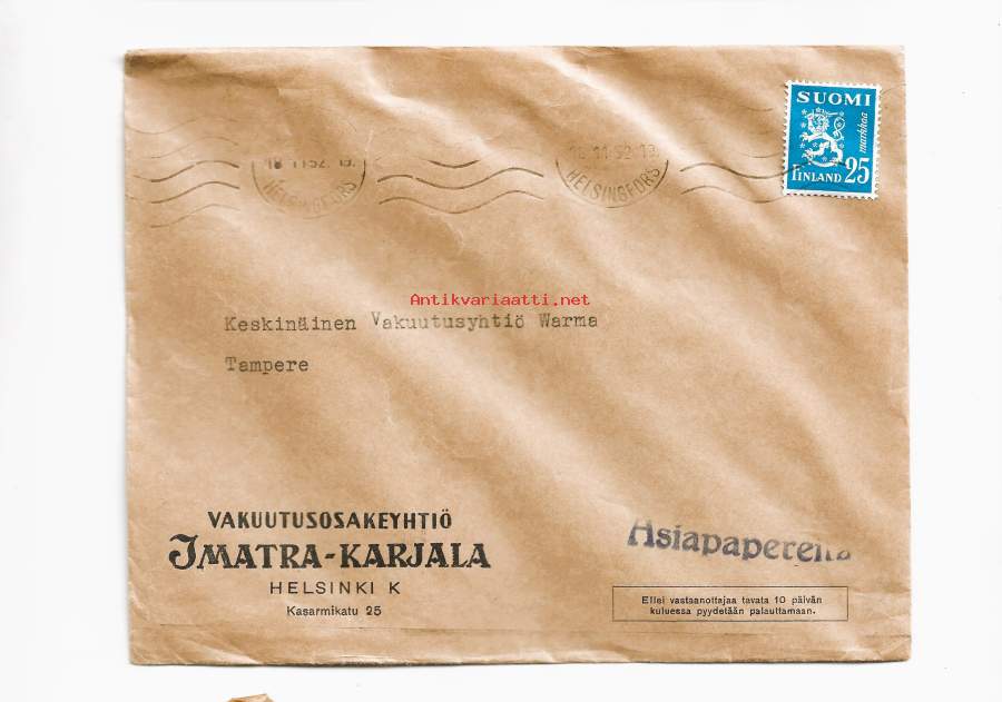 Vakuutusyhtiö Imatra-Karjala 1952 firmakuori