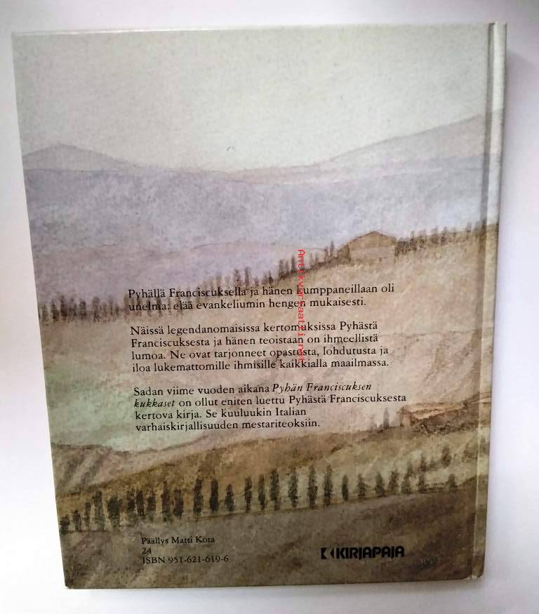 Pyhän Franciscuksen kukkaset (ital. I fioretti di san Francesco) on 1300-luvulla koottu suosittu keskiaikainen teksti, joka kertoo pyhimys Franciscus Assisilaisen ja hänen seuraajiensa elämästä, ihmeteoista ja opetuksista. Se on legendaarinen, proosarunollinen kokoelma, joka korostaa köyhyyttä, luontosuhdetta ja iloa.Postitus 6€