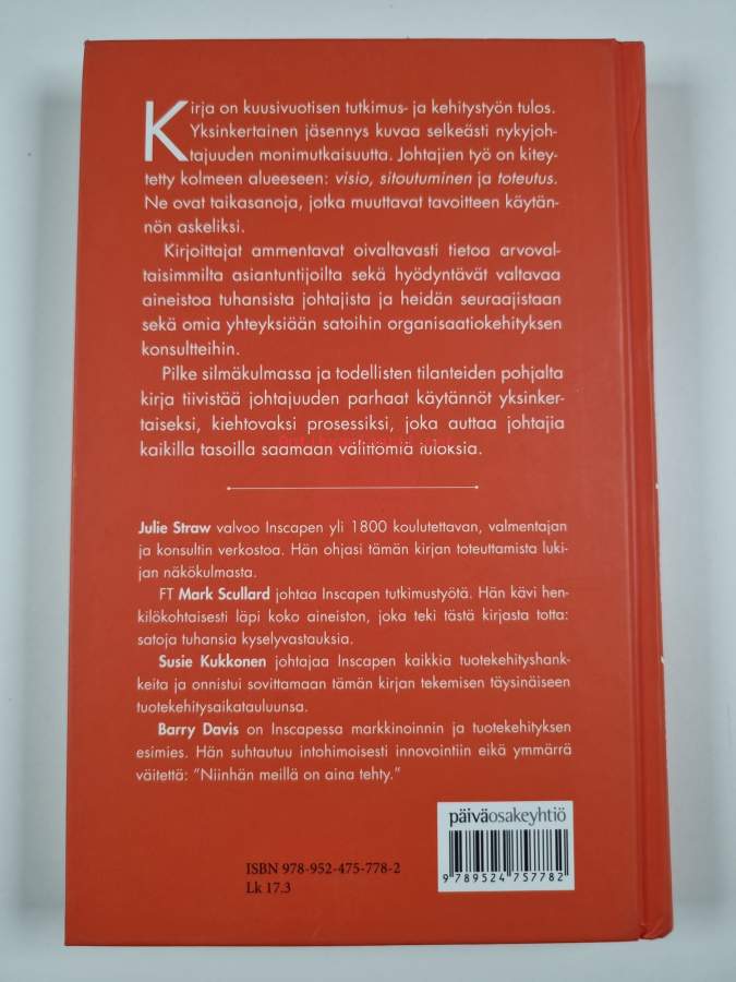 Muu(t) tekijä(t): Merja Pitkänen, Barry Davis ym.Alkuteos: The work of leadersAsiasanat: johtaminen, johtajat, johtajuus, visiot, hyvät käytännöt, sitoutuminen, sitouttaminen, toteutus, visioner, ledarskap (verksamhetsledning), ledare, förbindelse, ledarskap (egenskaper), god praxis, förverkligande, lojalitetsskapande