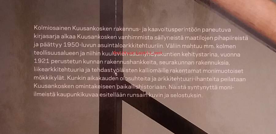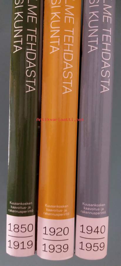 Sarja käsittelee Kuusankosken kaavoitus‑ ja rakennusperintöä vuosilta 1850–1959 kuvaten Kuusankosken kehitystä kolmen suuren teollisuuslaitoksen ympärille. Osa 1; 1850-1919, Osa2; 1920-139 ja Osa 3 1940-1959. Kuvitettu. Dimensiot 26 ¤ 22 cm.