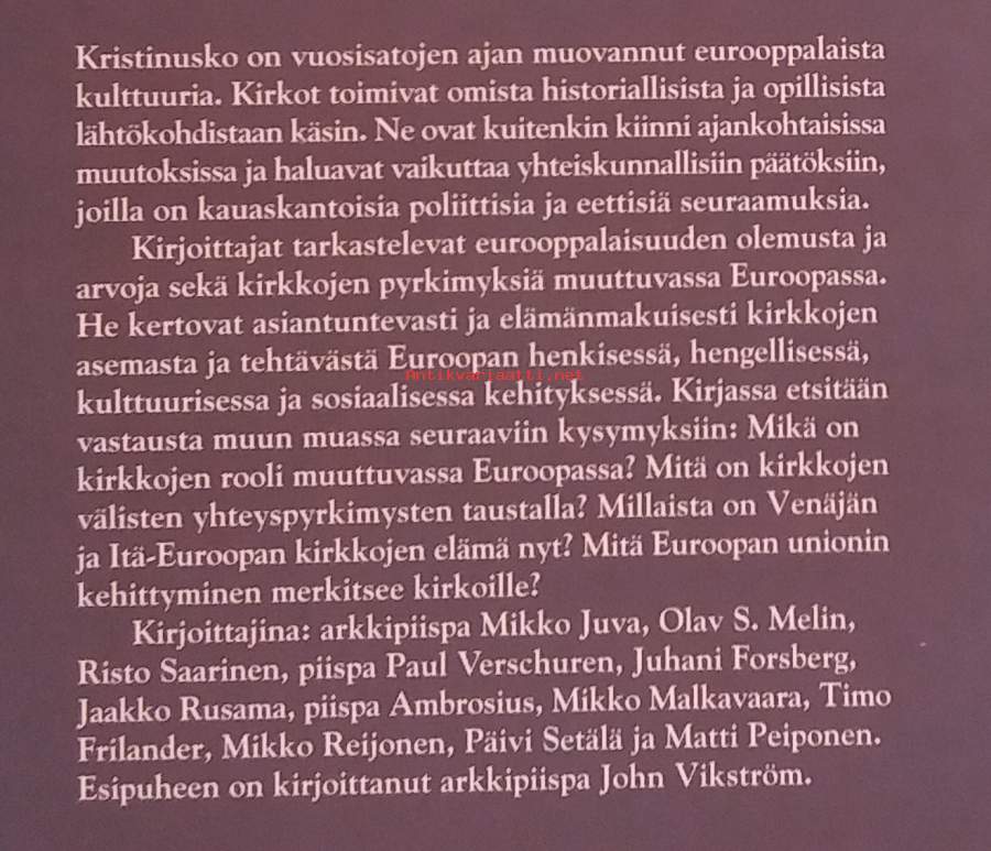 Asiantuntijakirja tarkastelee kirkkojen roolia, arvoja ja tehtävää muuttuvassa Euroopassa mm: Venäjän ja Itä-Euroopan kirkkojen tilanne, kirkkojen yhteyspyrkimykset ja eurooppalaiset arvot, EU:n kehityksen vaikutukset kirkkoihin jne. Dimensiot 21 ¤ 14 cm.
