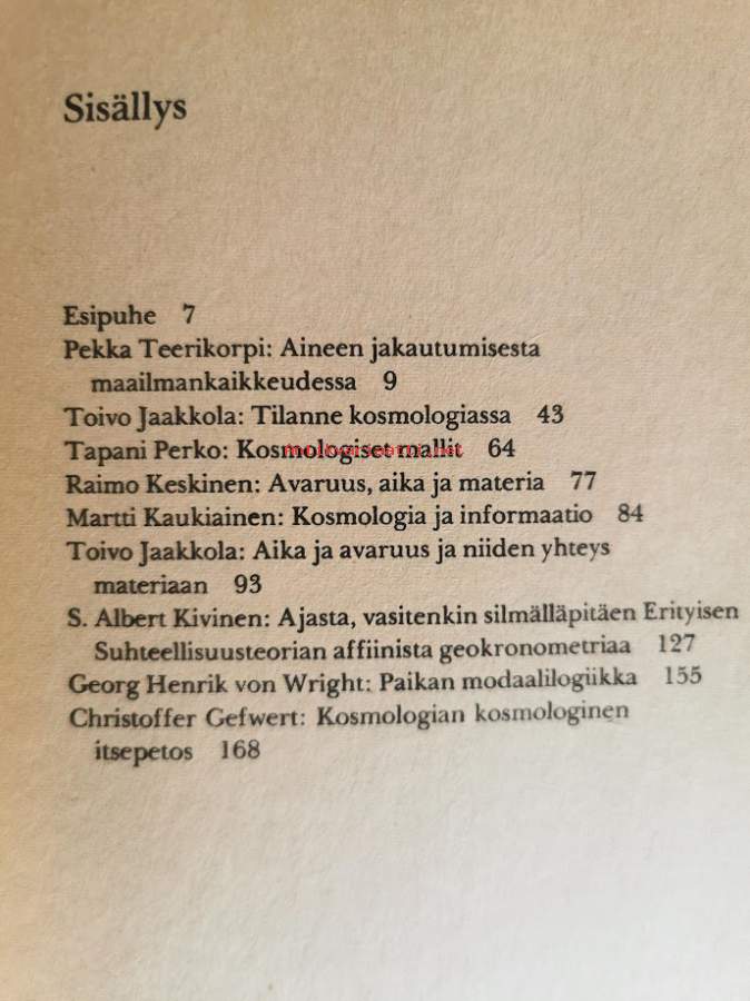 Teos perustuu 1976 Helsingin yliopiston Tähtitieteen laitoksen Kosmologian maailmankuva-seminaarin esitelmien pohjalta laadittuihin esitelmiin.Mm:- S. Albert Kivinen: Ajasta, vasitenkin silmälläpitäen Erityisen Suhteellisuusteorian affiinista geokronometriaa- G. H. von Wright: Paikan modaalilogiikka- Toivo Jaakkola: Aika ja avaruus ja niiden yhteys materiaaan