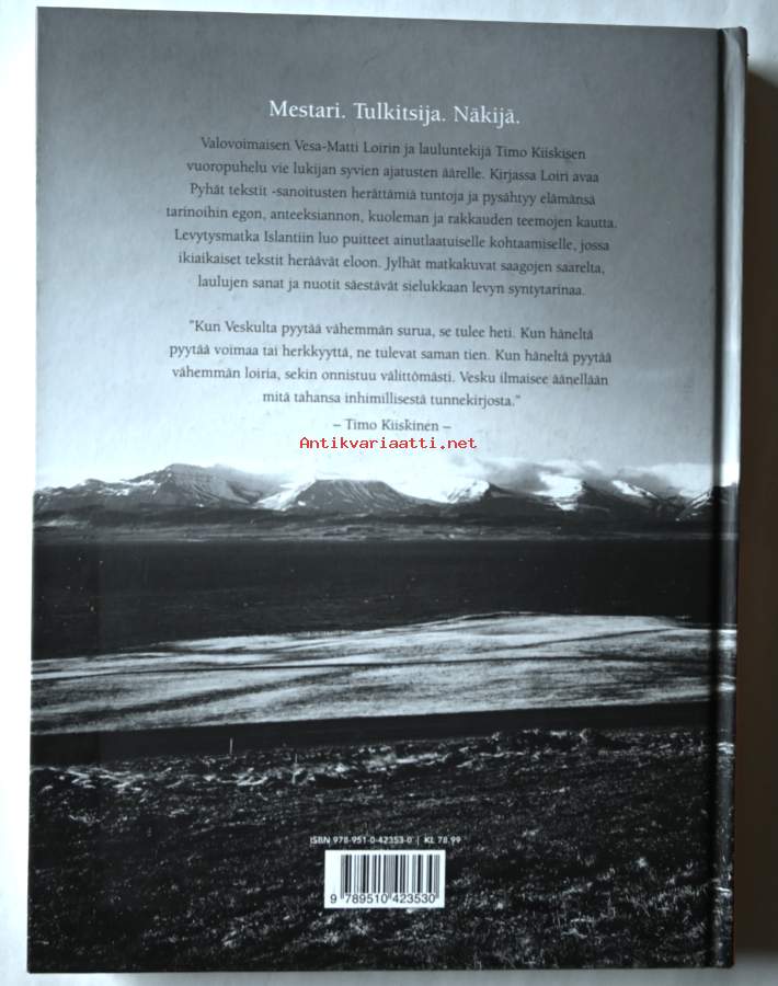 imo Kiiskinen ja Vesa-Matti Loiri jakavat samanlaisen maailmankuvan. Kolme vuotta sitten alkanut matka pyhien tekstien ja suurten kysymysten äärelle tuo esiin karismaattisen tulkitsijan mietteitä elämän valoista ja varjoista.Pyhät tekstit -projekti on 71-vuotiaalle Vesa-Matti Lorille hyvin henkilökohtainen. Kirjassa hän kertoo Pyhät tekstit -albumin laulujen herättämistä tunnoista ja pysähtyy elämänsä tarinoihin muun muassa anteeksiannon, egon, kuoleman ja rakkauden teemojen kautta. Loirin kertomusten lisäksi kirja sisältää levyn syntytarinan sekä nuotit ja sanat Pyhät tekstit -albumin 20 lauluun. Kirjassa on laaja kuvitus äänitysmatkalta Islantiin alkuvuodesta 2016.Timo Kiiskinen on monien tunnettujen laulujen sanoittaja ja säveltäjä ja Vesa-Matti Loirin pitkäaikainen ystävä.