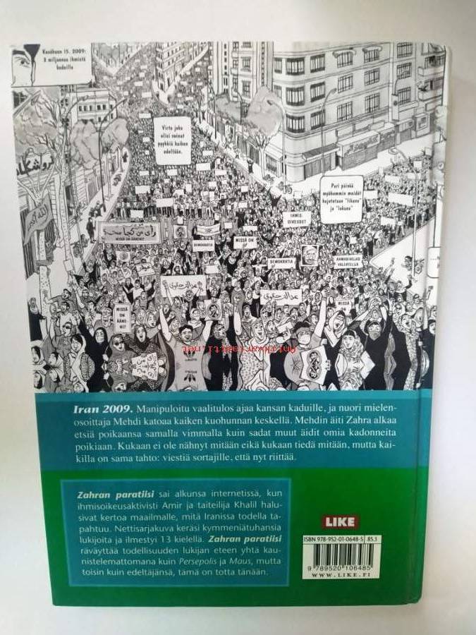 Zahra's paradise. Nuori mielenosoittaja Mehdi katoaa Iranin vaalien jälkimainingeissa vuonna 2009. Nuorukainen on hävinnyt hämäräalueelle, jossa oikeutta rehtiin oikeudenkäyntiin ei enää tunnusteta. Hänen muistoaan ei pidä elossa laki vaan rohkea ja peräänantamaton äiti ja bloggaava veli, jotka eivät suostu jättämään Mehdiä kohtalon käsiin. Molempien pahin pelko on se, että lukuisten muiden kapinoitsijoiden ja toisinajattelijoiden tavoin Mehdi päätyy Zahran paratiisiin - Iranin suurimmalle hautausmaalle.Zahran paratiisi punoo todellisten ihmisten ja tapahtumien kudelman. Tarina syntyi ja vaati tulla kerrotuksi, kun maailma todisti YouTuben videoissa, Twitterissä ja blogeissa jotain, mitä ei enää voitu lakaista maton alle. Iranin vaalien jäljiltä on edelleen kateissa satoja mielenosoittajia, joita äidit etsivät epätoivon vimmalla.Postitus 7€