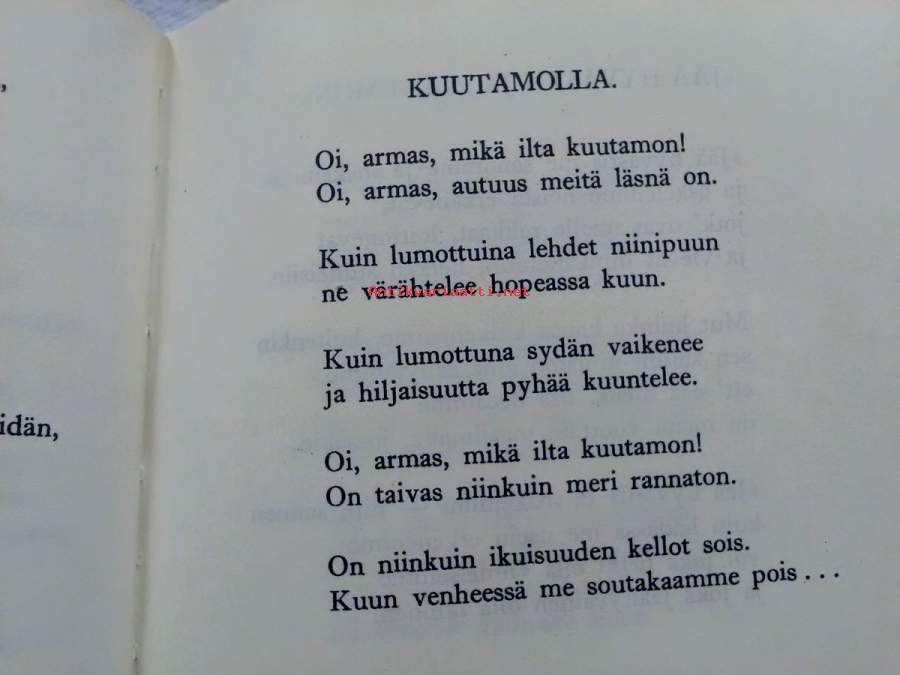 omistus, tyhjälle takasivulle kirjoitettu käsin runo, sivujen kulmia taitettu merkiksi hyvistä runoista