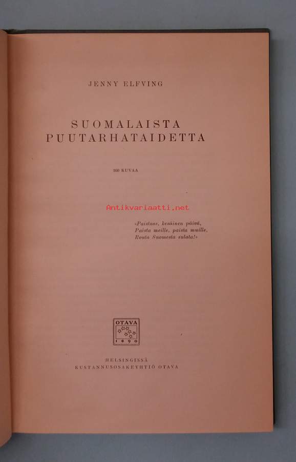 Jenny Elfving oli suomalaisen puutarhaopetuksen ja naisten koulutuksen uranuurtajia. Teoksessa "Suomalaista puutarhataidetta" hän käsittelee aihetta tiedon jakamisen ohella myös tunteiden kannalta.Kuvitettu.Dimensiot: 23*15cm.