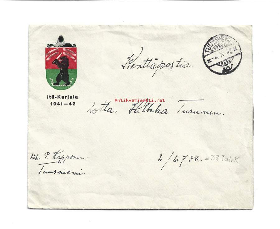 Itä-Karjala 1941 -1942 Kenttäpostia kuori 1942