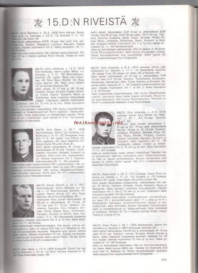 15. Divisioonan riveissä taistelleiden sotilaiden matrikkeli. Sotien yleisesittely ja historia, 15. Divisioonan osuus siinä, sen jälkeen varsinainen matrikkeliosuus.