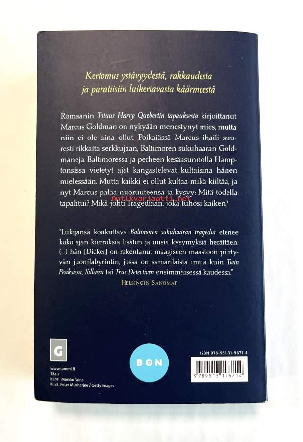 Harry Quebertin kirjoittajan uutuus!Kertomus ystävyydestä, rakkaudesta ja paratiisiin luikertavasta käärmeestä. Dickerin varmaotteinen nuoruudenkuvaus viihdyttää jokaista lukijaa.Esikoisromaanillaan Totuus Harry Quebertin tapauksesta maailmanmenestykseen noussut Joël Dicker palaa uudessa kirjassaan kirjailija Marcus Goldmanin nuoruuteen. Poikaiässä Marcus ihailee suuresti rikkaita serkkujaan, Baltimoren sukuhaaran Goldmaneja. Baltimoressa ja perheen kesäasunnolla vietetyt ajat kangastelevat kultaisina hänen mielessään. Mutta kaikki ei ollut kultaa mikä kiiltää, ja nyt Marcus palaa nuoruuteensa ja kysyy: mitä todella tapahtui? Mikä johti draamaan, joka tuhosi kaiken?