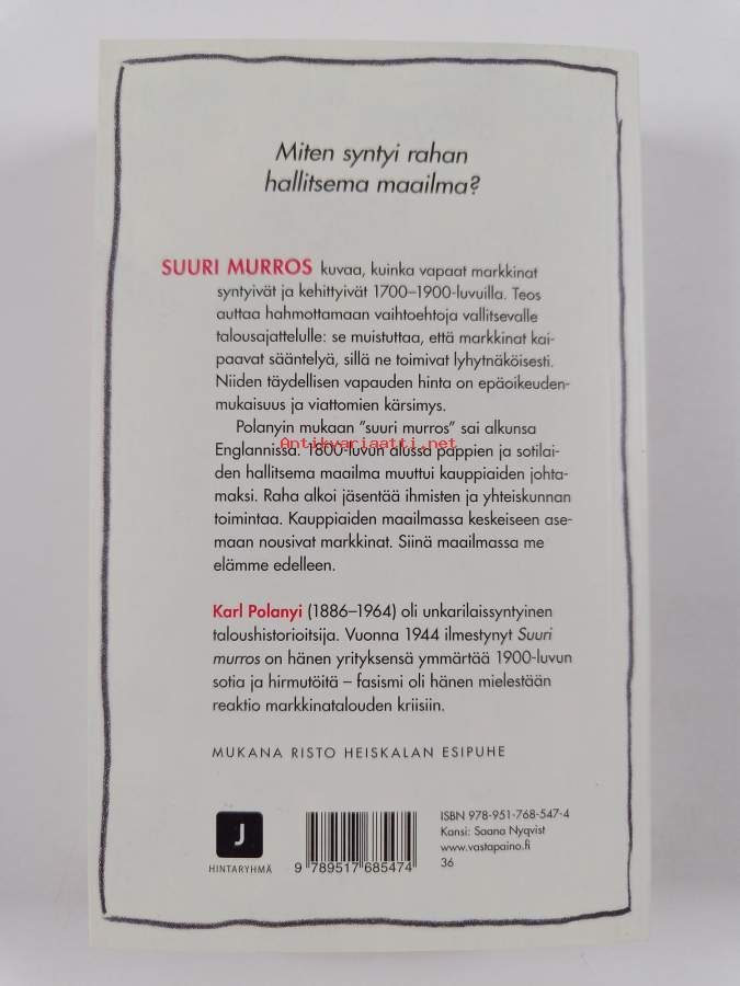 Muu(t) tekijä(t): Natasha Vilokkinen, Risto HeiskalaAlkuteos: The Great Transformation. The Political and Economic Origins of Our TimeAsiasanat: taloushistoria, Liberalismi, markkinatalous, talousjärjestelmät, markkinat, taloudellinen antropologia