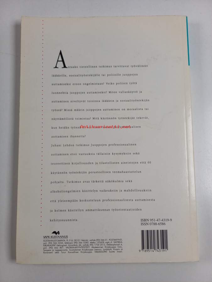 Koko nimi: Juoppojen professionaalinen auttaminen : tutkimus lääkäreiden, sosiaalityöntekijöiden ja poliisien juoppouteen kohdistamasta työstä ja siihen kohdistuvien professionaaliodotusten vaikutuksestaSarja: Tutkimuksia / Sosiaali- ja terveyshallitus 1Asiasanat: alkoholismi, alkoholistit, päihdehuolto, sosiaalityöntekijät