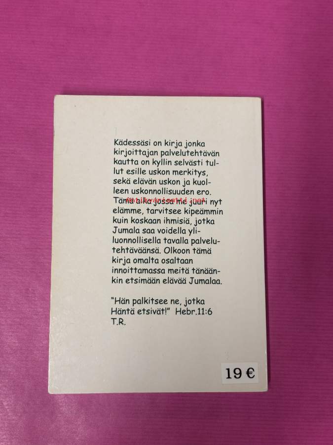 Kädessäsi on kirja jonka kirjoittajan palvelutehtävän kautta on kyllin selvästi tullut esille uskon merkitys, sekä elävän ja uskon kuolleen uskonnollisuuden ero. Tämä aika jossa me nyt elämme, tarvitsee kipeämmin kuin koskaan ihmisiä, jotka Jumala saa voidella yliluonnollisella tavalla palvelutehtäväänsä. Olkoon tämä kirja omalta osaltaan innoittamassa meitä tänäänkin etsimään elävää Jumalaa."Hän palkitsee ne, jotka Häntä etsivät!" Hebr.11:6 T.R.