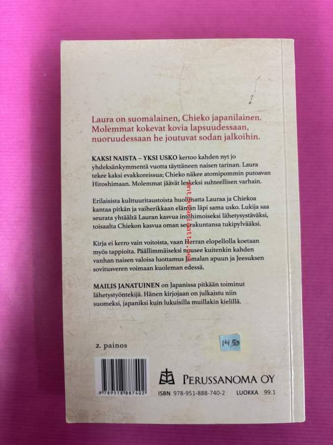 KAKSI NAISTA - YKSI USKO kertoo kahden nyt jo yhdeksänkymmentä vuotta täyttäneen naisen tarinan. Laura tekee kaksi evakkoreissua; Chieko näkee atomipommin putoavan Hiroshimaan. Molemmat jäävät leskeksi suhteellisen varhainErilaisista kulttuuritaustoista huolimatta Lauraa ja Chiekoa kantaa pitkän ja vaiherikkaan elämän läpi sama usko. Lukija saa seurata ylhäältä Lauran kasvua intohimoiseksi lähetysystäväksi, toisaalta Chiekon kasvua oman seurakuntansa tukipylvääksi.Kirja ei kerro vain voitoista, vaan Herran elopellolla koetaan myös tappiota. Päälimmäiseksi nousee kuitenkin kahden vanhan naisen valoisa luottamus Jumalan apuun ja Jeesuksen sovitusveren voimaan kuoleman edessä.